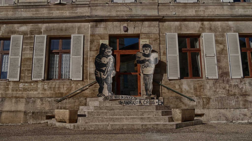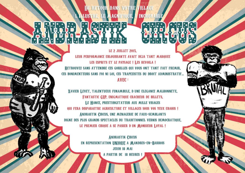 Les habitant-e-s de Mandres-en-Barrois ont pu assister aujourd’hui au défilé de l’Andrastik Circus. L’unique représentation est annoncée pour jeudi soir 20h à la mairie du village. On retrouvera en tête d’affiche Xavier Levet qui vient de s’offrir une jolie casserole pour faux et usage de faux. On attend également avec impatience Emmanuel Hance qui avait su créer le buzz en janvier lors de sa dernière incursion dans le bois Lejuc. Sans oublier bien sûr Brutale et André, les vigi-gorilles qui ne manqueront pas de garder la porte de l’édifice municipal.