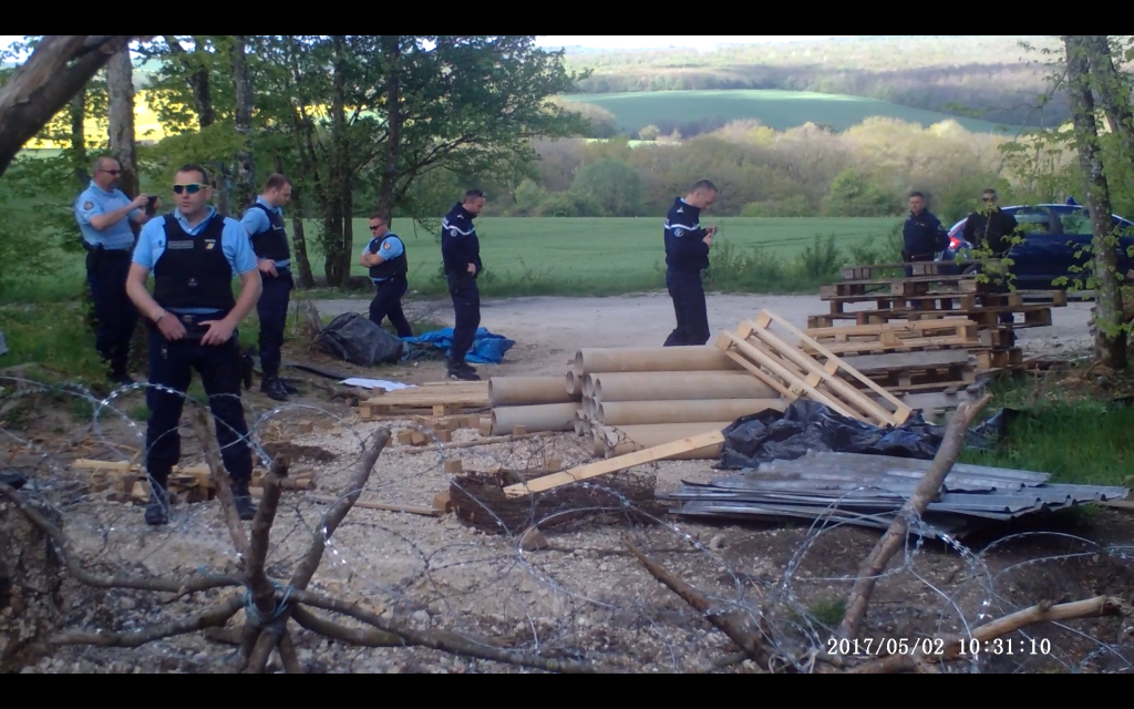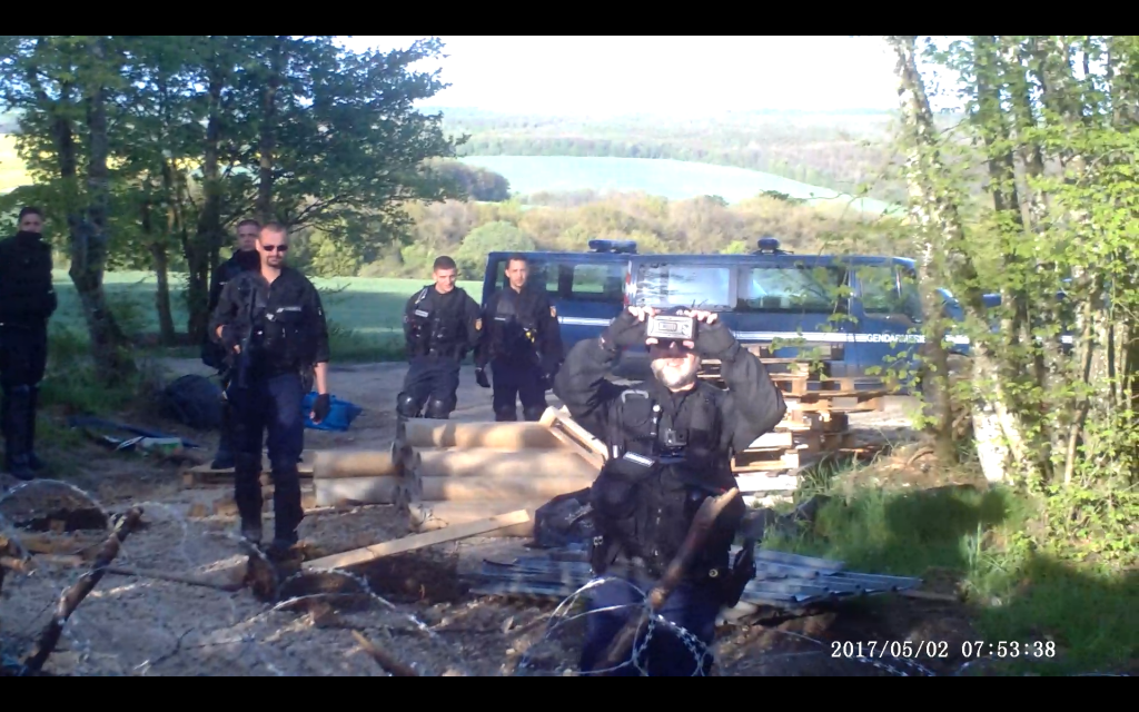 - 17h43 : 50 gendarmes mobiles bloquent l’accès à la mairie. Belle mascarade que de faire peser sur les épaules d’une dizaine d’élus d’un village de 130 habitants, sous pression et sous la protection des flics, l’échange d’un bois permettant le début des travaux du plus gros projet industriel européen