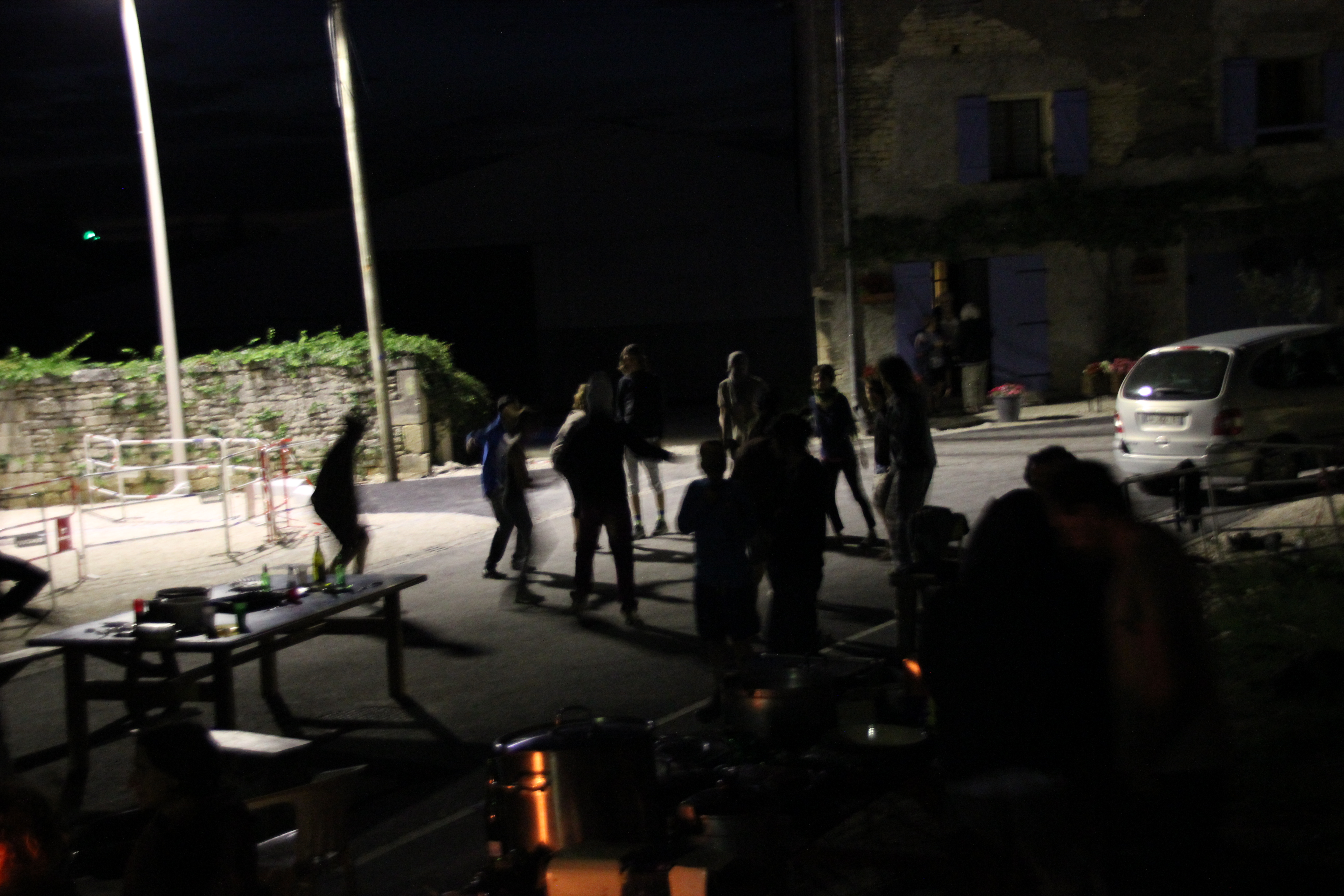 C’est l’indisposition causée par le passage de 3856ème patrouille de police de la journée, rappel de l’intimidation constante que constitue l’état de militarisation du territoire, qui pousse alors les convives à installer leur table sur la chaussée flambante neuve en face de la maison de résistance, pour y banqueter dans l’allégresse et proposer aux prochaines patrouilles un itinéraire alternatif. Après manger, une partie de foot improvisée fut interrompue par deux gendarmes, demandant instamment de bouger la table, qui « gênerait les déplacements sur la voie publique. » Après leur avoir opposé un refus cordial mais ferme, assurant que nous écarterions la table pour laisser passer les tracteurs et moissonneuses (promesse tenue avec assiduité et célérité tout au cours de la soirée) , la fête se poursuivit tranquillement avec une partie de bowling-pétanque, alors que la patrouille suivante contournait la maison, provoquant quelques rires.