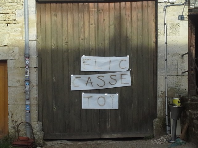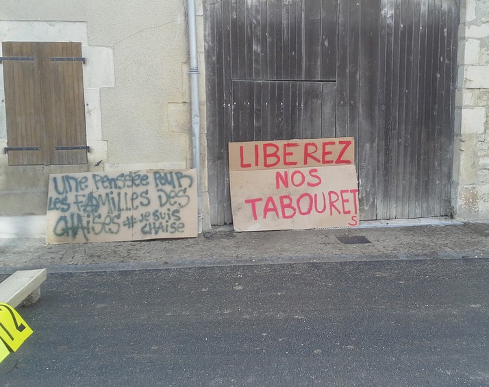 Face au harcèlement policier permanent qui se passe à Bure et ses environs : contrôles d’identité, contrôles routiers, guet-appent au bois de chaufour, courses poursuites, hélico qui passe pour nous regarder sortir des pommes de terre, passage au ralenti caméra à la main jusqu’à 30 fois par jour devant nos lieux de vie (que ce soit la maison de la résistance, les barricades en forêt ou les maisons personnelles d’opposant.es au projet CIGEO), on a décidé de mettre 4 tabourets symboliques sur la route devant la maison de la résistance pour les obliger à sortir de leur voiture pour les mettre de côté à chaque fois qu’ils passent. Encombrement temporaire destiné seulement aux flics, qu’on retirait au passage des habitant.es.