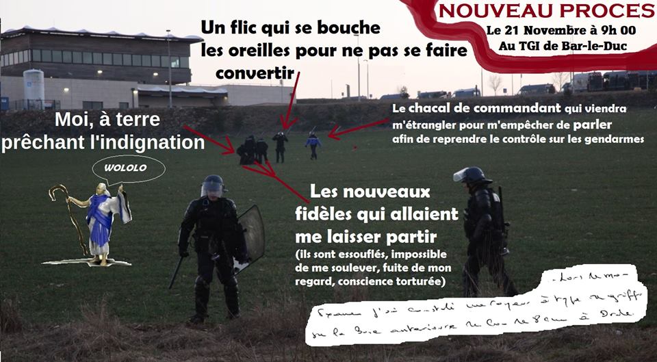 Peut-être avez-vous eu peur que je porte plainte ? C’est vrai que la police, lorsqu’elle violente quelqu’un, elle aime prendre les devants par sécurité.Mais je ne compte pas utiliser la justice pour trouver réconfort, pas comme vous qui demandez 400€ parce qu’un paysan de Bure crie « Mange Merde »(1). L’argent n’achète point le repos de ma conscience. La vérité suffit.