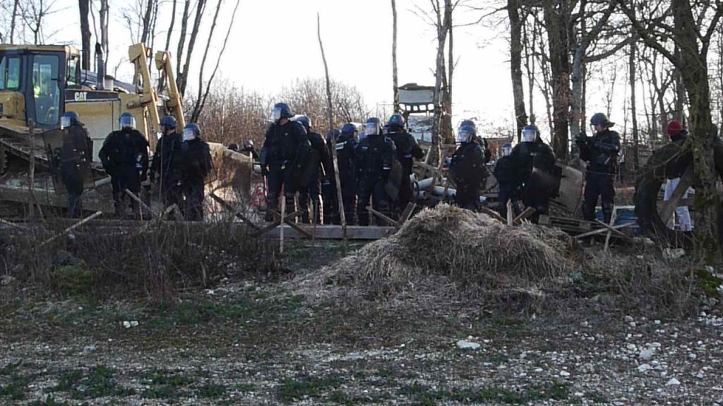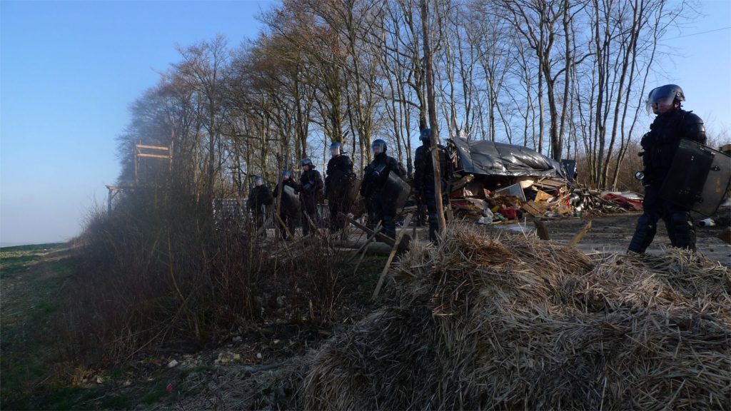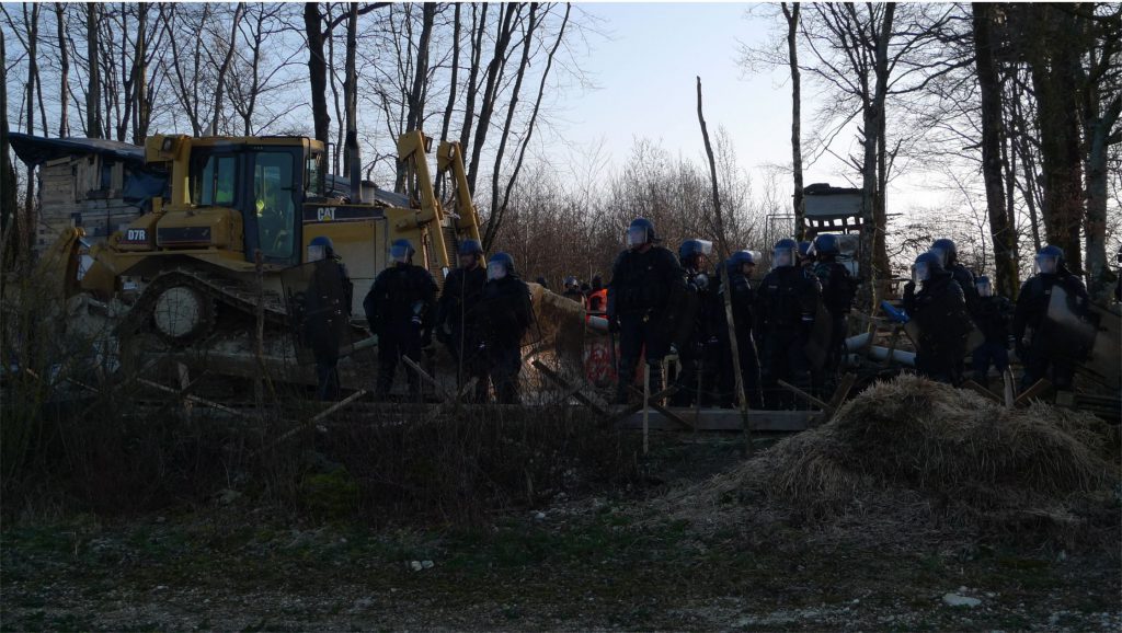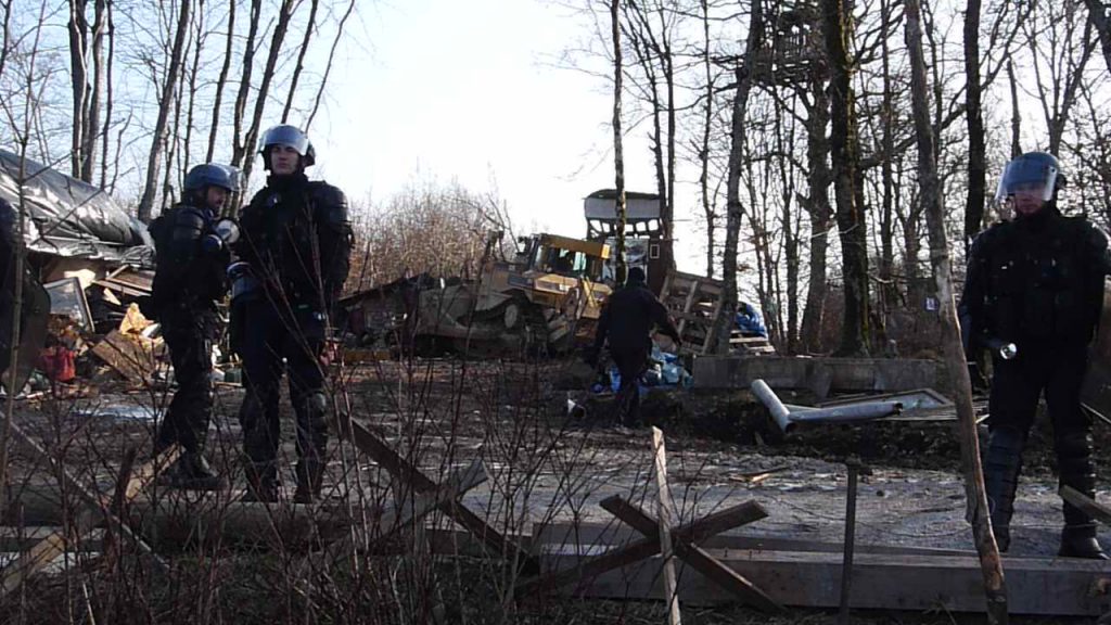 Quand on est arrivés au niveau de la barricade, vers 9h du matin, le dispositif policier était en place, le bulldozer était démarré mais la destruction n’avait pas encore commencé. A notre arrivée ils ont éteint leur machine et s’en est suivi un long face à face entre nous et les flics. Au bout de 20 minutes de ce face à face, d’autres véhicules de police sont arrivés en renfort et ils ont remis en route la machine de destruction. Alors, on s’est postés au plus près de la barricade. On ne pouvait rien faire d’autre que de faire face, le coeur serré, sans croire ce qu’on voyait – et prendre un maximum d’images. On n’a pas pu prendre une vidéo de la destruction de la cuisine du Futur, faute de place dans l’appareil photo. Elle s’est effondrée avec une majesté incroyable, sa boule à facette a tenu le coup.