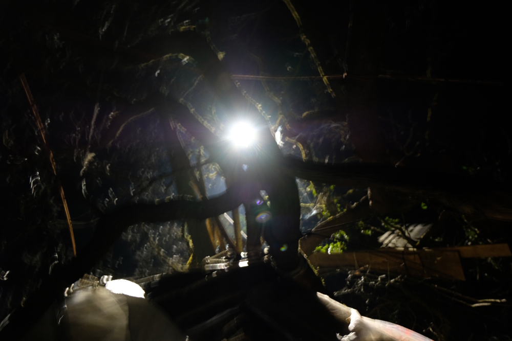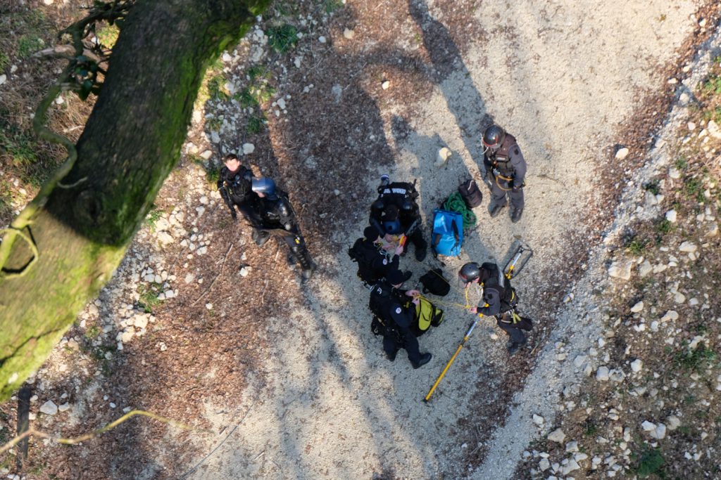 Nous avons été réveillé.e.s par un coup de téléphone à 6h30 du matin. Il faisait encore nuit mais par terre à 25 mètres en dessous de nous on voyait des lumières. On s’est demandé si c’était des copain.e.s mais les projecteurs éclairaient la cabane, il faisait clair comme en plein jour, ce ne pouvait être que des gendarmes. Au téléphone, la même nouvelle est confirmée, vigie sud, vigie sud est et barricade nord sont cernées et envahies par les militaires.