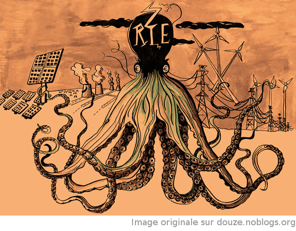On citera aussi dans l’actualité brûlante les manigances de RTE à Saint Victor dans le sud Aveyron, où un projet de méga transformateur électrique est prévu, sorte de nœud d’un réseau transnational de transport de l’énergie. Ce projet, prévu sur les terres d’un agriculteur opposé au projet, est destiné à intensifier l’implantation d’éoliennes industrielles (plusieurs centaines). Ces usines autonomes et interconnectées servent à légitimer la communication « green », « smart » et « connectée » des pollueurs et exploiteurs de l’énergie qui spéculent sur les « marchés carbone ».