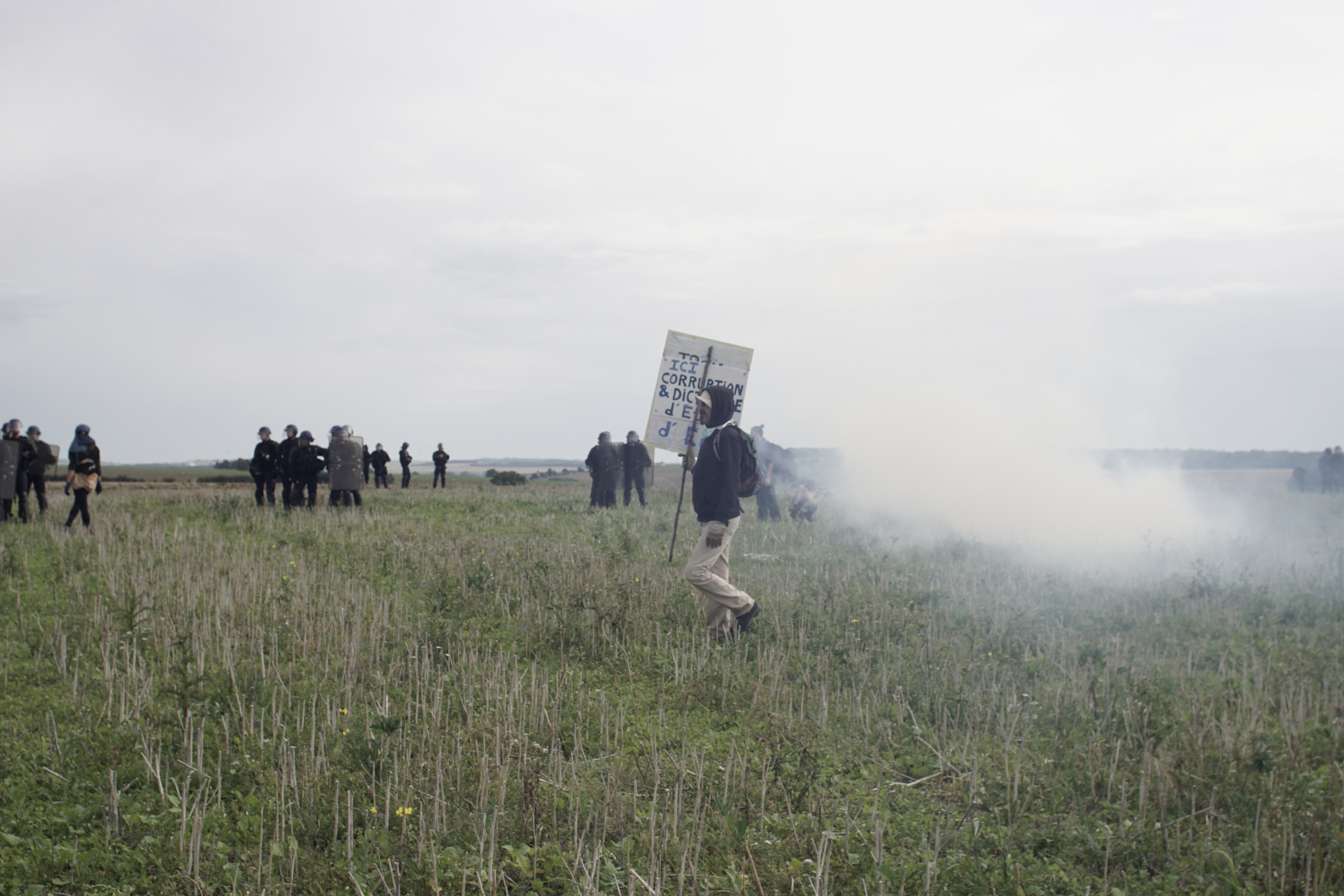 Le projet d’enfouissement de déchets nucléaires à Bure a fait de ce bout de terre et de forêt un territoire assiégé. L’occupation militaire permanente et la résistance déterminée rythment depuis quelques années cette lutte contre l’industrie la plus meurtrière de France. Pendant la manifestation du 15 août dernier contre le centre de l’Agence nationale de déchets radioactifs, le site prévu d’enfouissement au milieu des champs fut rendu inaccessible par des escadrons de gendarmes mobiles. Ils ne tireront pas à balles réelles ce jour là – des policiers et des gendarmes ont déjà brandi des armes à feu contre des manifestants ces derniers mois – mais feront encore usage de grenades explosives qui mutilent et tuent.