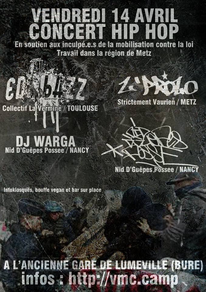 Au programme : Le collectif anarkorap La Vermine nous viendra de Toulouse, El Prolo et La Bergerie les rejoindront de Metz, et une partie du collectif Nid d’guêpes, de Nancy, partagera la scène avec eux ! (K-Listo de Soledad est annulé)