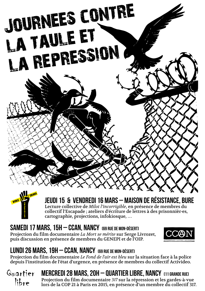 et le 28 mars à Nancy à la librairie Quartier Libre, projection du film les 317 (documentaire d’un collectif qui recueille les témoignages de la repression et des 317 gardés à vue en novembre 2015 lors de la Cop 21), en présence d’une personne du collectif