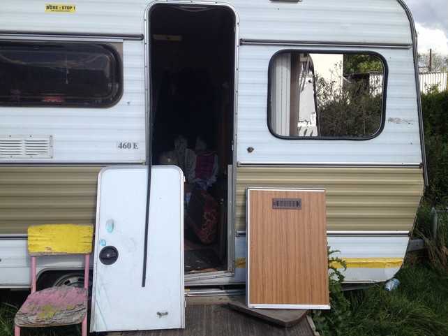 Réveillée par des coups sur la porte de la caravane. Je vois les lumières blanches à travers les fenêtres. On crie « Ouvrez ! Ouvrez! » – »Qui ce qui se passe ? » – »Ouvrez tout de suite! »
