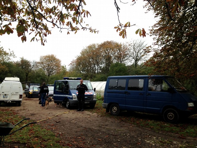 « Vous êtes seule ? » – »Oui. » « Restez ici, ne sortez pas, assise là. » Un flic posté pour me surveiller pendant que je fume ma clope. « Un OPJ va venir vous expliquer ce qui se passe ». Je m’habille, attend 40 minutes. J’en interpelle certains, demande où est l’OPJ en question. Pas de réponse, des sourires moqueurs. De l’intérieur j’entends, verre qui se brise, bois des portes de la grange qui craque et cède, portes des camions vides ouverts au pied-de-biche.